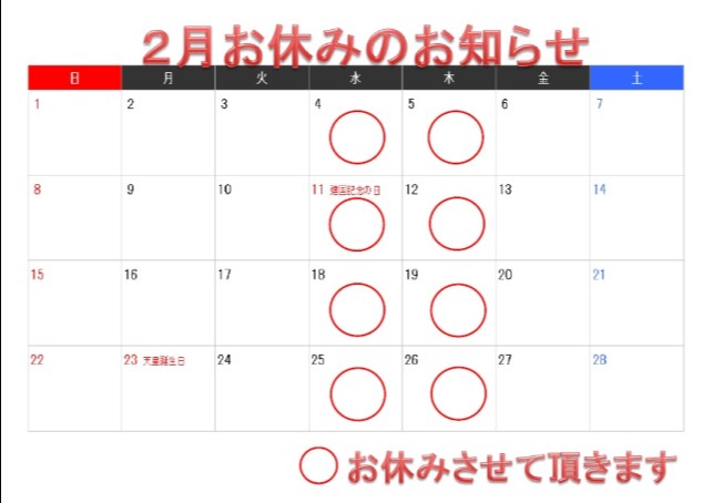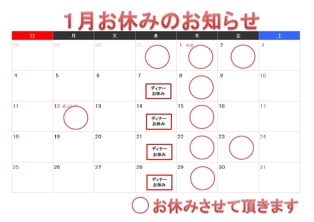 2016年1月お休みのお知らせ更新しました。