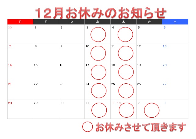 12月のお休みと年末年始休業のお知らせ更新しました。