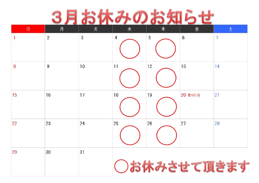2017年3月お休みのお知らせ更新しました。