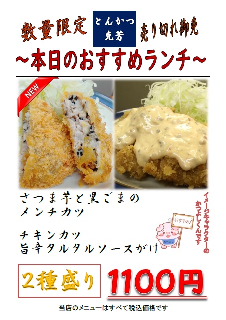 数量限定 売り切れ御免・さつま芋と黒ごまのメンチカツ ・チキンカツ 旨辛タルタルソースがけ ¥1100 |