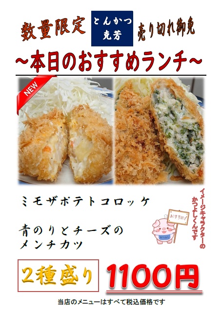 数量限定 売り切れ御免・ミモザポテトコロッケ ・青のりとチーズのメンチカツ ¥1100 |
